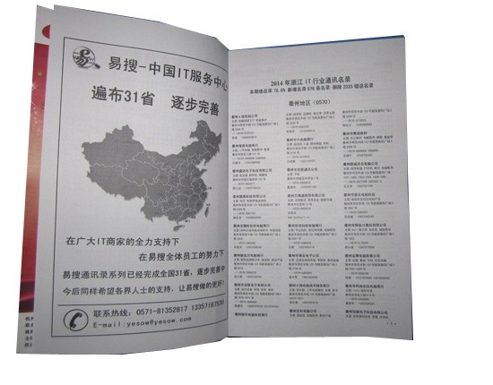 这本通讯录集结了我们全体员工的心血,精心,精诚,准确是我们的宗旨,对我们全体员工来说也是意义深刻,十年来,无数IT商家从易搜找到客户,我们也更努力,与您一同进步,如果您是浙江的IT商家,那就赶快行动起来吧,或许下一个你的客户就在这本书中。